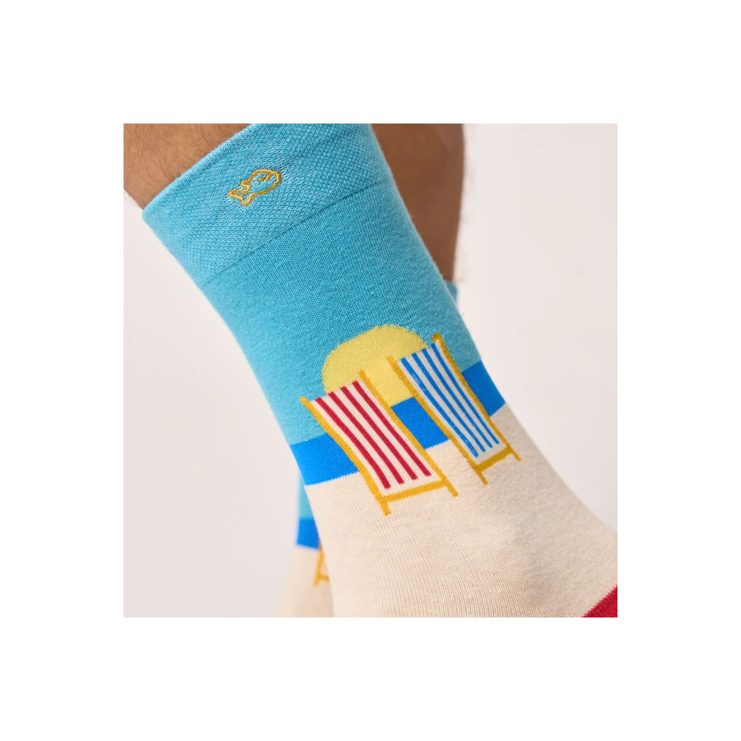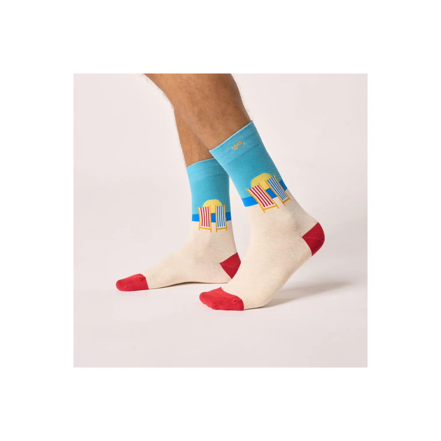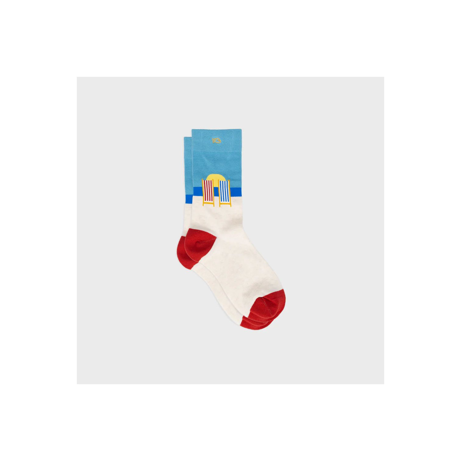 Découvrez des chaussettes à motifs idéales pour vos escapades : confortables, en coton peigné, avec un motif paysage qui évoque le voyage. Elles sont mi-mollet, certifiées OEKO-TEX, et leurs pointes et talons sont renforcés. Taille unique (41-46), disponibles en écru et bleu. Composition : 80% coton peigné, 17% nylon, 3% élasthanne. Entretien : lavage en machine à 30°, s
