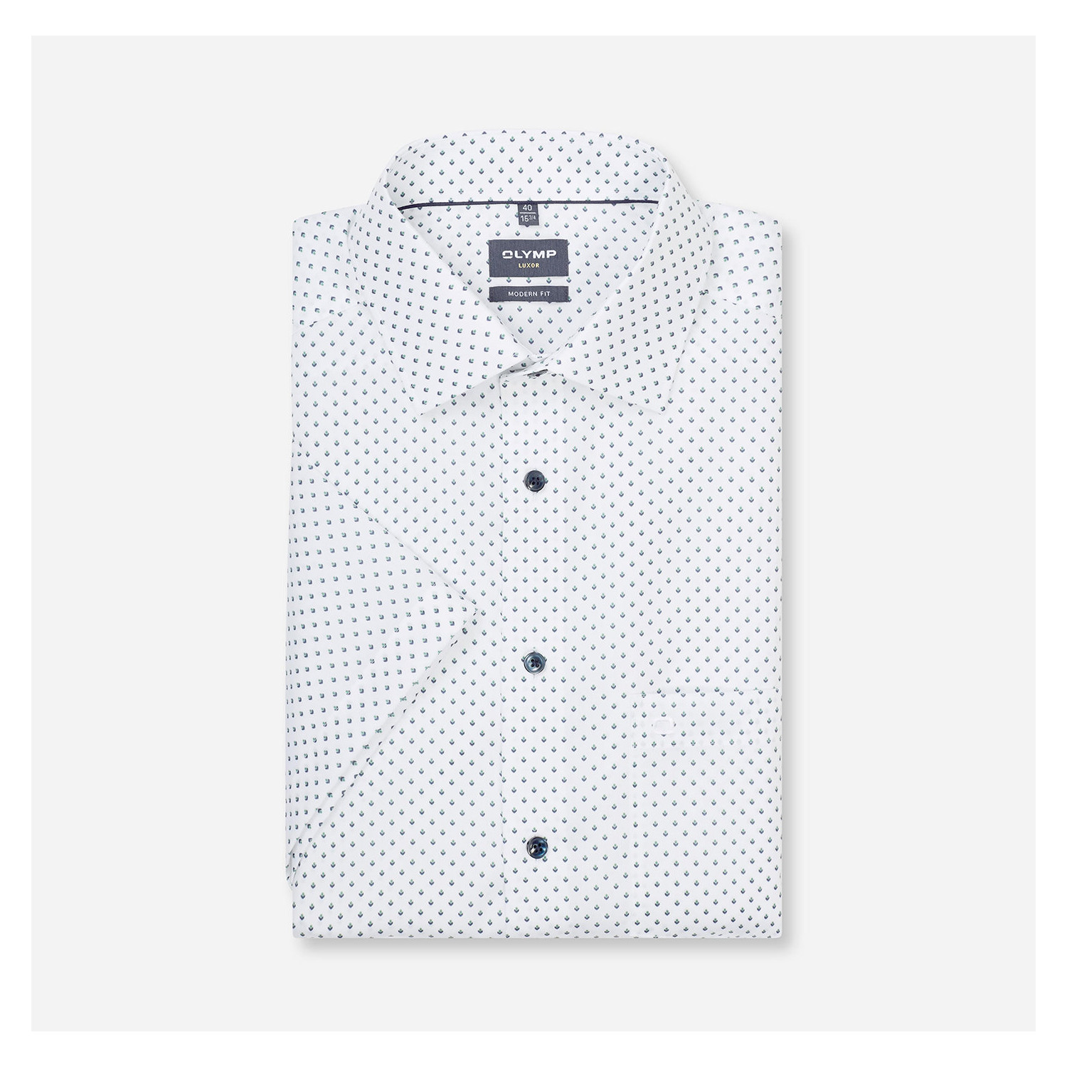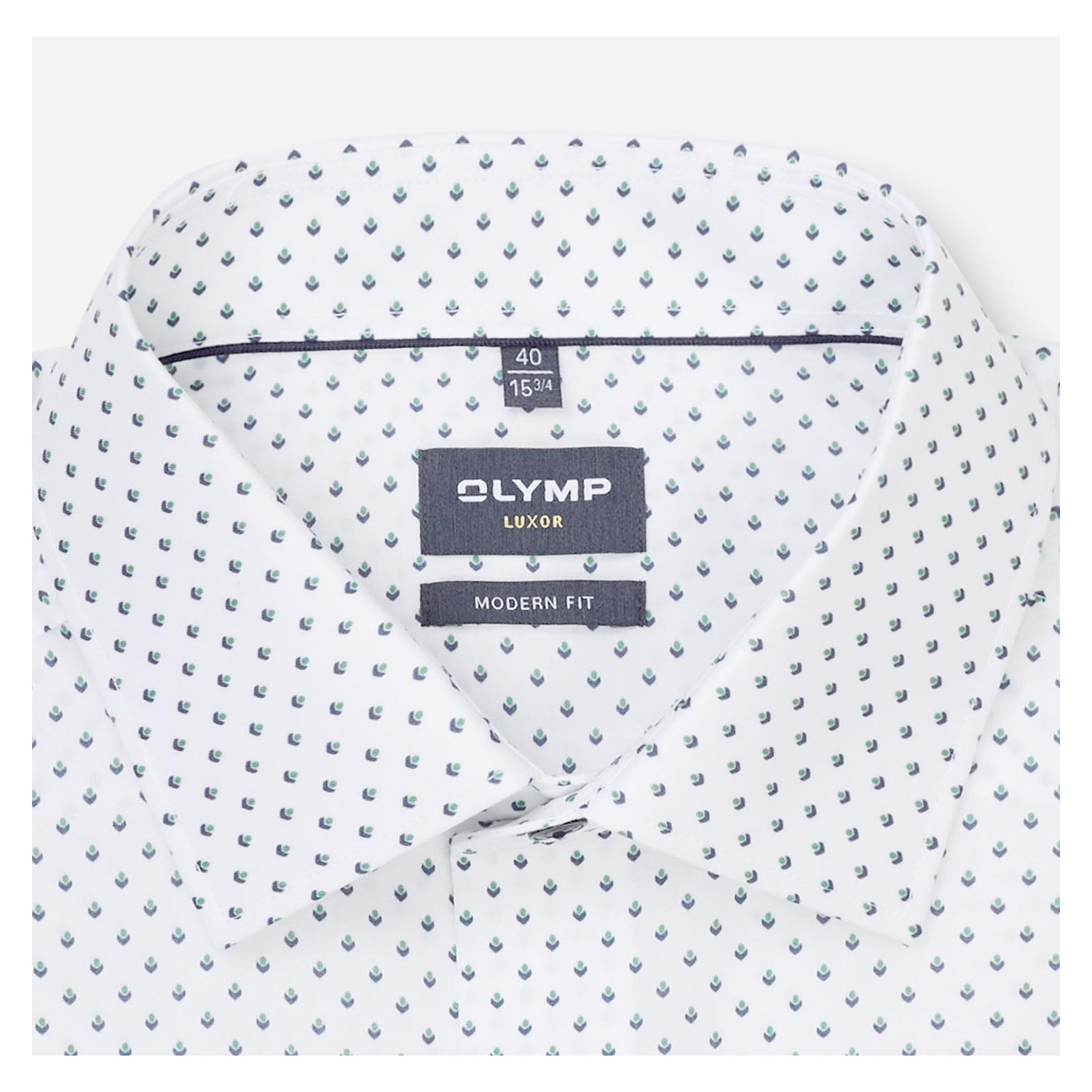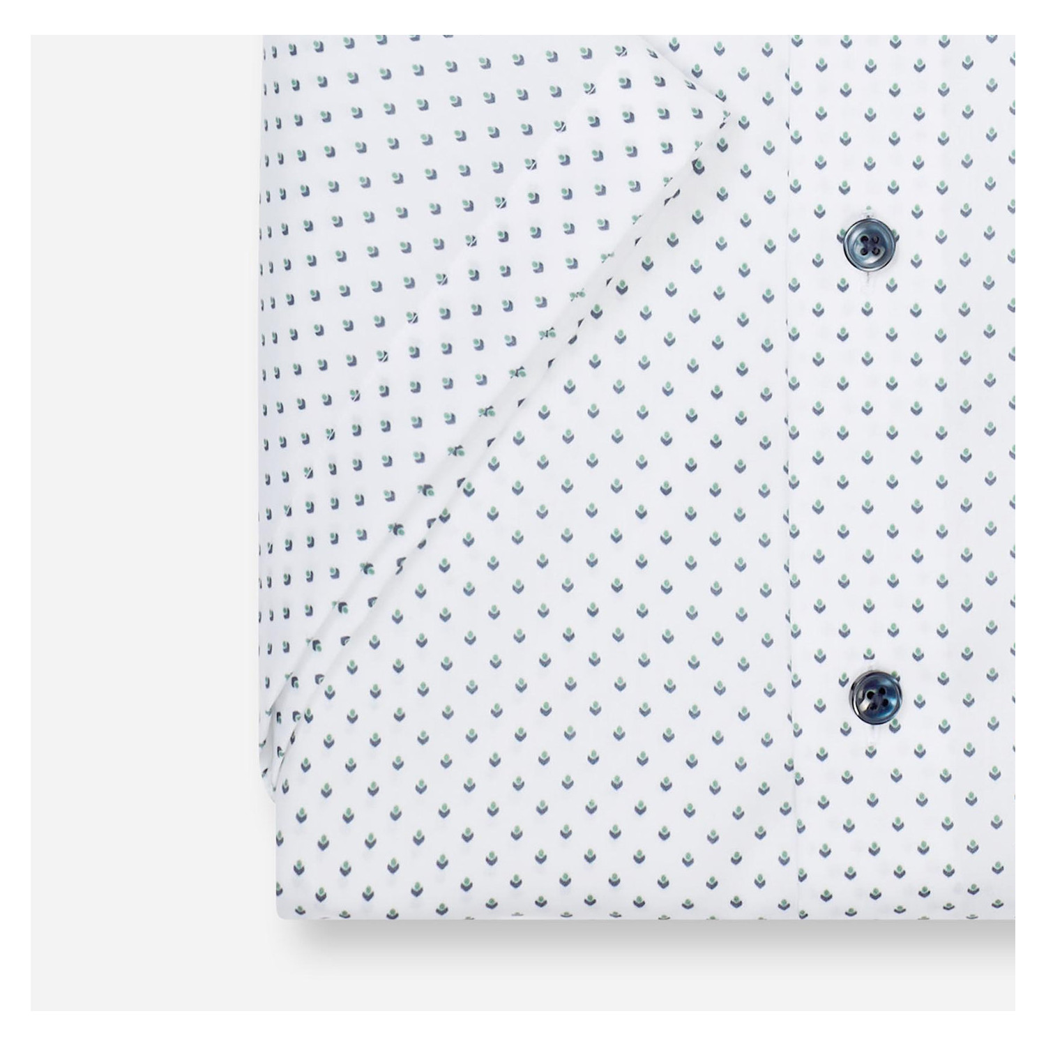 Chemise blanche OLYMP Luxor à manches courtes confectionnée en twill 100 % coton, ornée d'un motif subtil de petites géométries en vert foncé et bleu marine. Elle possède un col New Kent et des boutons bleu foncé qui créent un contraste marqué. Sa conception sans repassage et infroissable garantit une apparence soignée, et sa manchette réglable offre une fonction combinée. Cette version modern fit est en blanc avec un col New Kent, des manches demi-longues, et est certifiée OEKO-TEX® STANDARD 100 . Elle permet à la peau de respirer et est agréable au toucher, avec une gorge rabattue qui ne nécessite pas de repassage et reste indéformable.