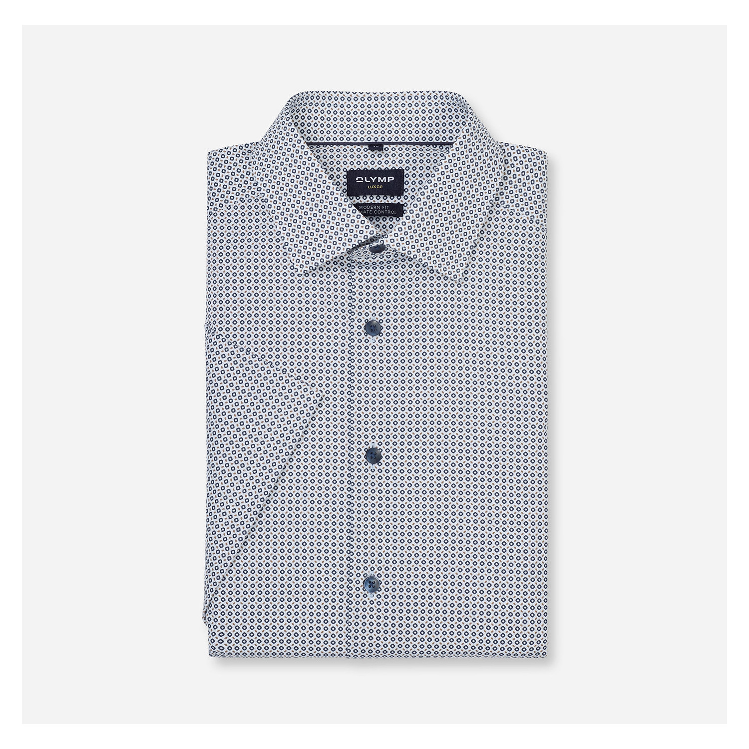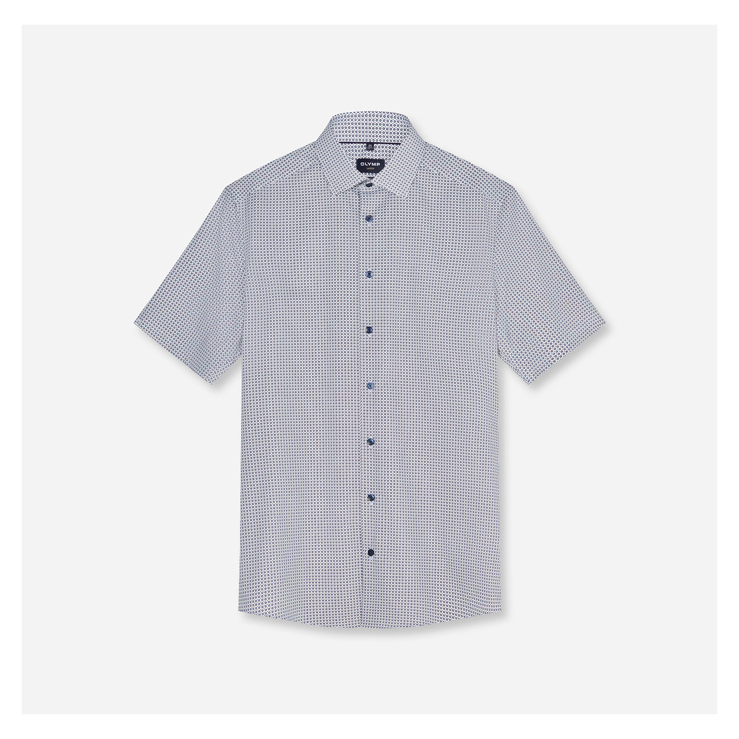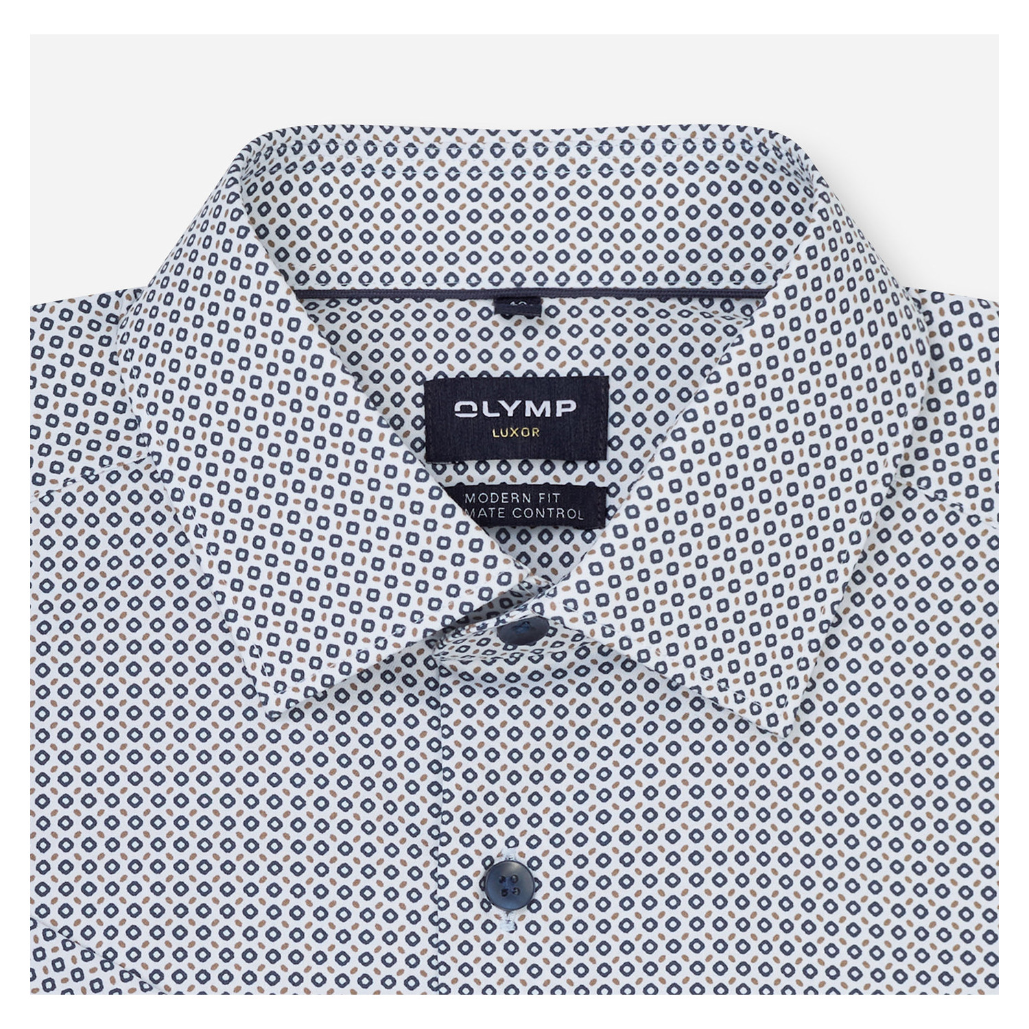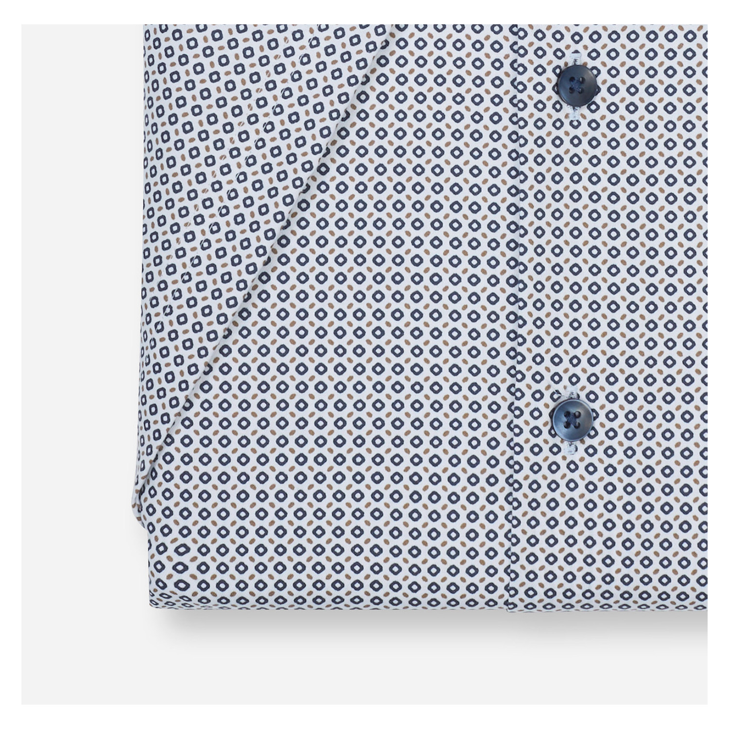 Cette chemise OLYMP en tissu sergé allie un imprimé géométrique moderne à une haute technicité textile. Disponible en coupes modern fit ou comfort fit, elle arbore une teinte nougat élégante rehaussée de motifs bleus et blancs et d'un col New Kent. Grâce à la technologie 24/7 Climate Control, elle assure une régulation thermique optimale tout en étant antibactérienne et infroissable. Son mélange de coton extensible garantit un confort durable, une excellente tenue et un entretien facilité.