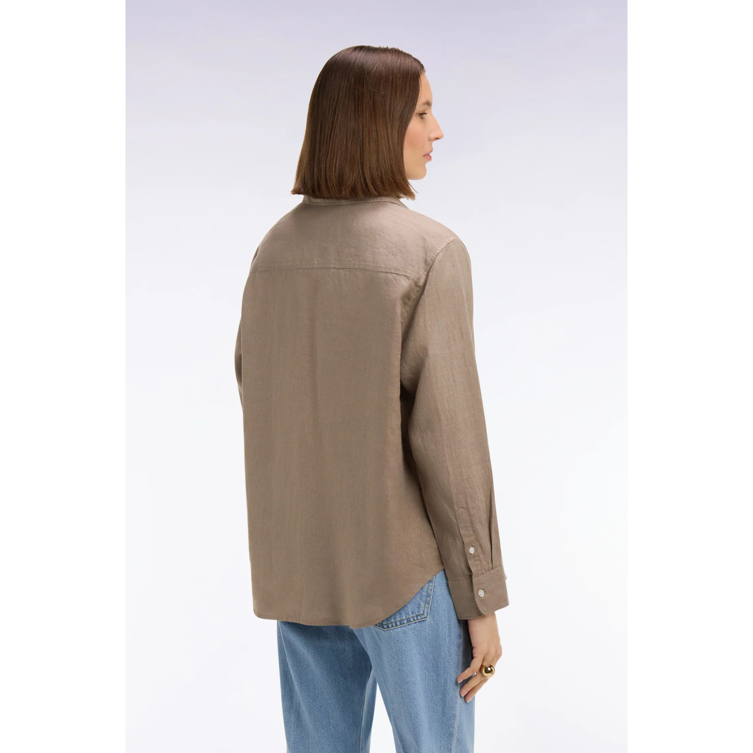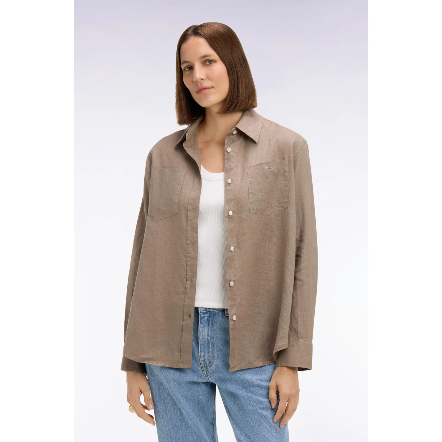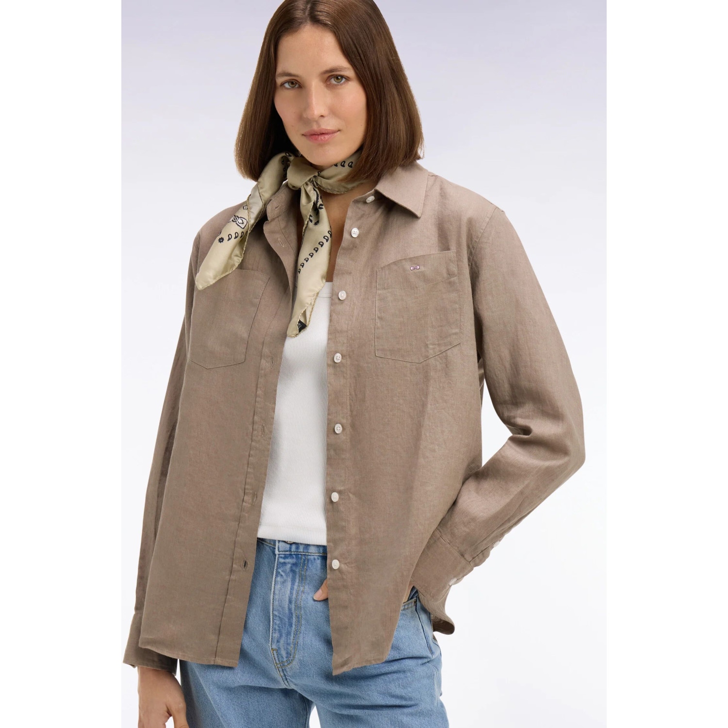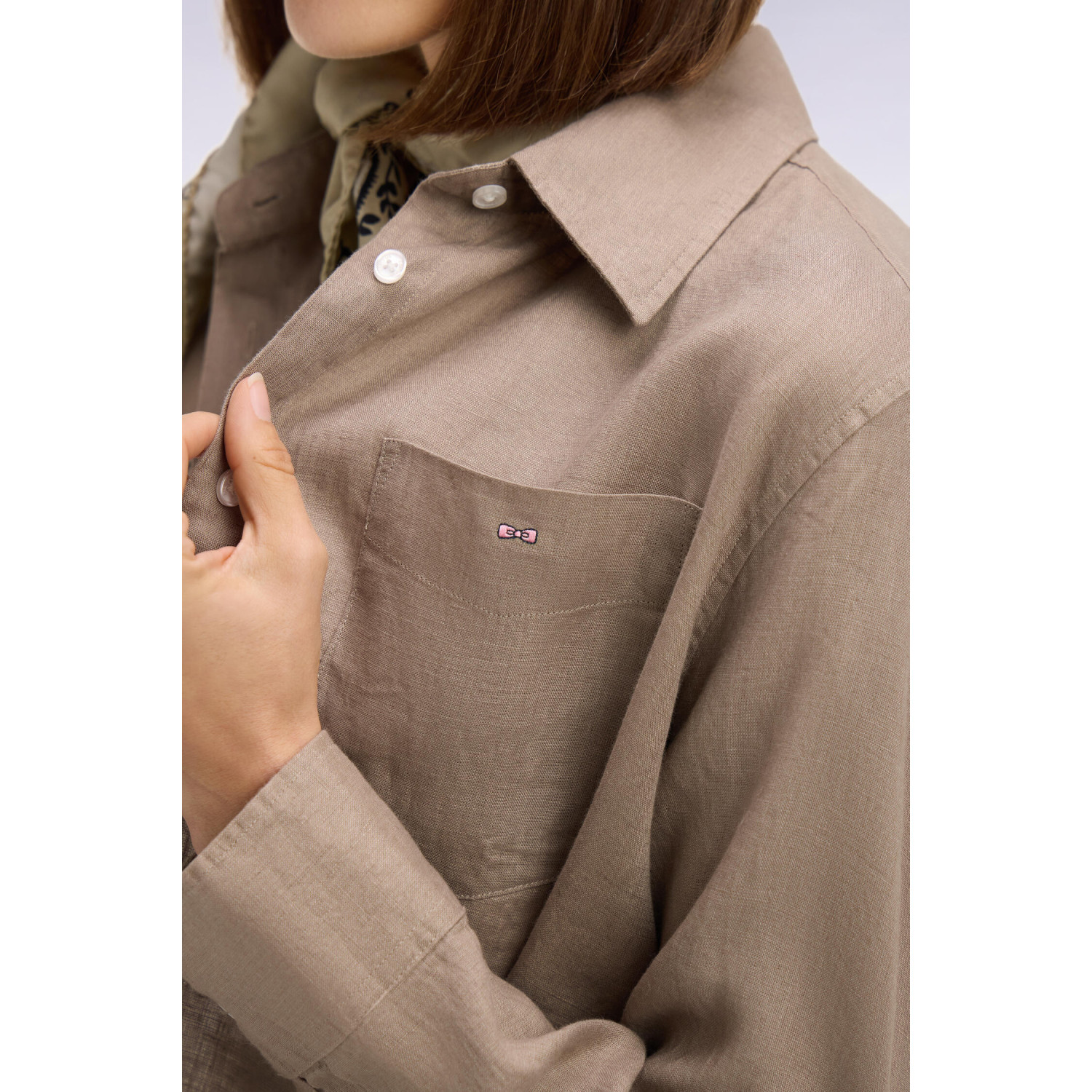 Pensée pour créer de nombreuses tenues tout au long de l'été, cette chemise en lin pur représente une interpretation casual chic dans une version féminine et aérée. Ses deux poches sur la poitrine, son boutonnière visible et sa broderie distinctive lui confèrent un caractère unique tout en restant simple et élégante. Le lin procure un drapé léger, parfait pour l'été et la mi-saison. Elle peut être portée ouverte sur un débardeur, nouée à la taille avec un jean ample ou rentrée dans un pantalon flare pour un style naturel et raffiné du matin jusqu'au soir.