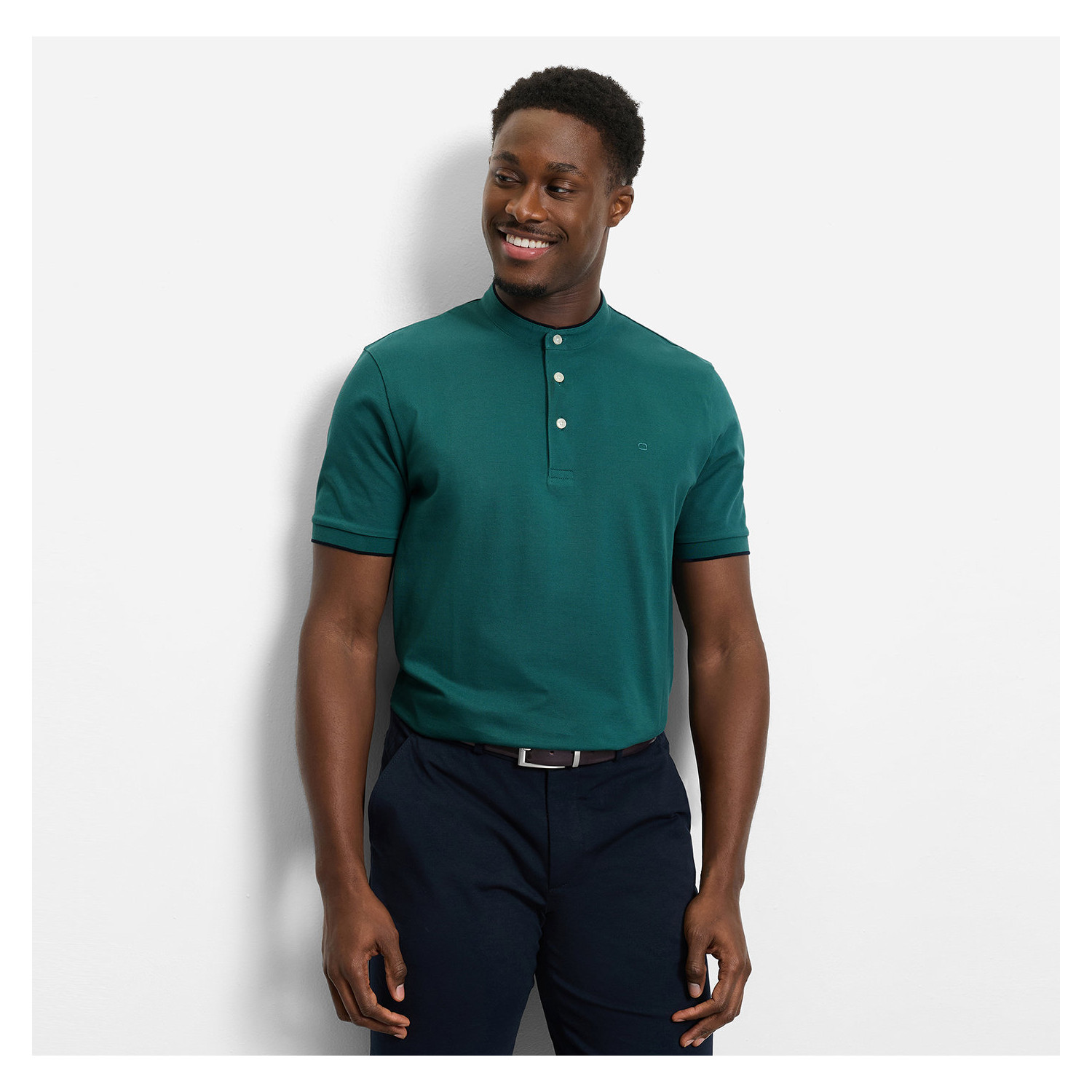 Polo turquoise OLYMP en piqué, fabriqué en 100 % coton. Son col montant avec tissu contrasté ajoute des touches lumineuses. La texture de la surface confère une apparence soignée. C'est un allié fiable pour des moments décontractés. Coupe régulière, manches courtes, style confortable et décontracté. Indéformable et simple à entretenir.