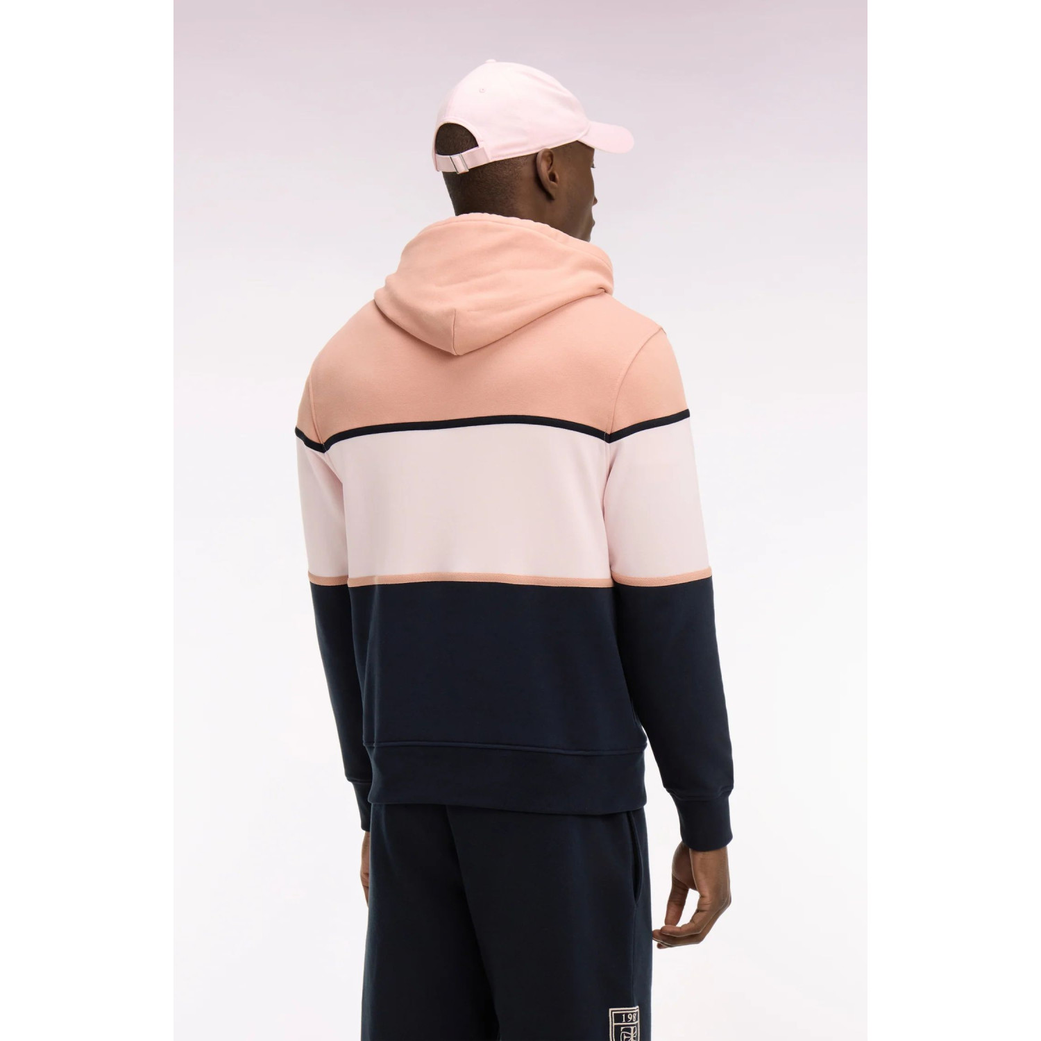 Revisitez votre vestiaire décontracté avec ce sweatshirt à capuche en molleton 100% coton, au design colorblock harmonisant marine et tons pastels. Ses découpes structurées lui confèrent une allure graphique et moderne, tandis que sa broderie signature souligne son héritage sport-chic. Ce modèle à la coupe regular dispose d'une capuche doublée, de cordons de serrage et de finitions en bords-côtes. Pratique avec ses poches latérales, il est parachevé par l'emblématique nœud papillon brodé à la base.